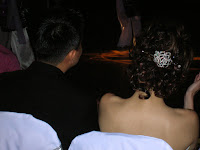 White paper laterns hung from the ceiling. A gobo with their monogram spread across the floor. White orchids were on every table, along with a questionnaire for guests to fill out their favorite memories of Our Katie and Kam, guess their children's names, etc. etc. etc. The guests flowed in. It seemed as though most of the guests loved Our Katie as much as we did. Her cousins each sang a song with the band, their Buddhist friends put on quite the dance routine which involved lifts, spins, acrobatics, and ribbons, her maid of honor played a tape of 6 year old Katie singing. Our Katie, ever the gracious host, and loving to be the center of attention, spent a lot of time on the mike thanking everyone and entertaining.