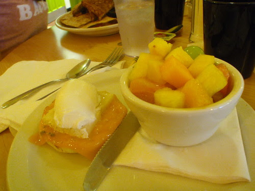 Thatmom saw that they made benedicts and had them create one especially for her - an english muffin with a slice of cheddar cheese, and a poached egg on top. Both Thatmom and I both loved the fact that you could get half a benedict, because neither of us can finish a whole one.