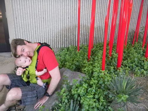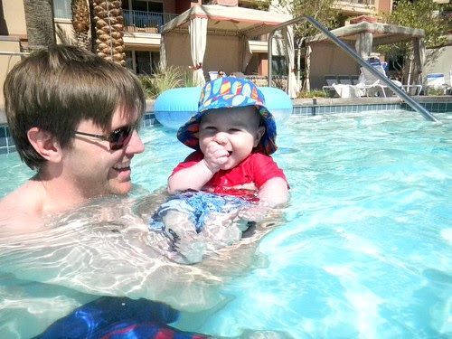 Thatbaby is also quite the carnivore. He enjoys meats and poultry of all kinds. Which is great since he can up his iron by sucking on a nice piece of steak or porkchop. And it's also nice because it means when we eat out, like when we were in Palm Desert last weekend, I can simply cut him a slice of my food and he can just go to town.