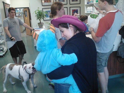 I know I've mentioned how much I love our community, and how we're within 3 miles of pretty much everything we need (the store, daycare, postoffice, our doctors, etc.). Which meant we could walk down to our shopping center where they were hosting their own trick-or-treat event.