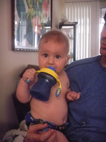 When you move beyond the bottle stage, it's time for the sippy cup.  We never used one.  Both Thatboy and I use plastic cups with lids and plastic straws - which keeps waters safe from flailing baby arms.  Around 4 months, Thatbaby became very interested in our straw cups.  It wasn't long before he was trying to drink from them, and actually getting water out.  So we bought him a Playtex 'lil gripper straw cup at 6 months.