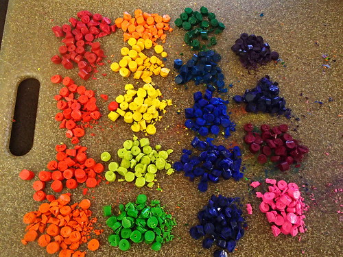 First, you chop up a box of crayons. I used about 28 crayons for my project, which made 14 heart crayons.